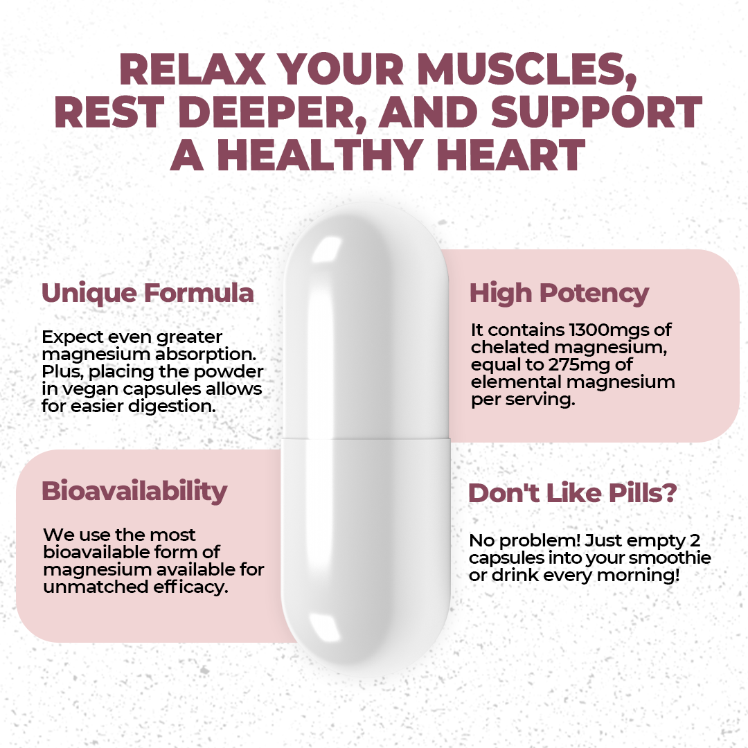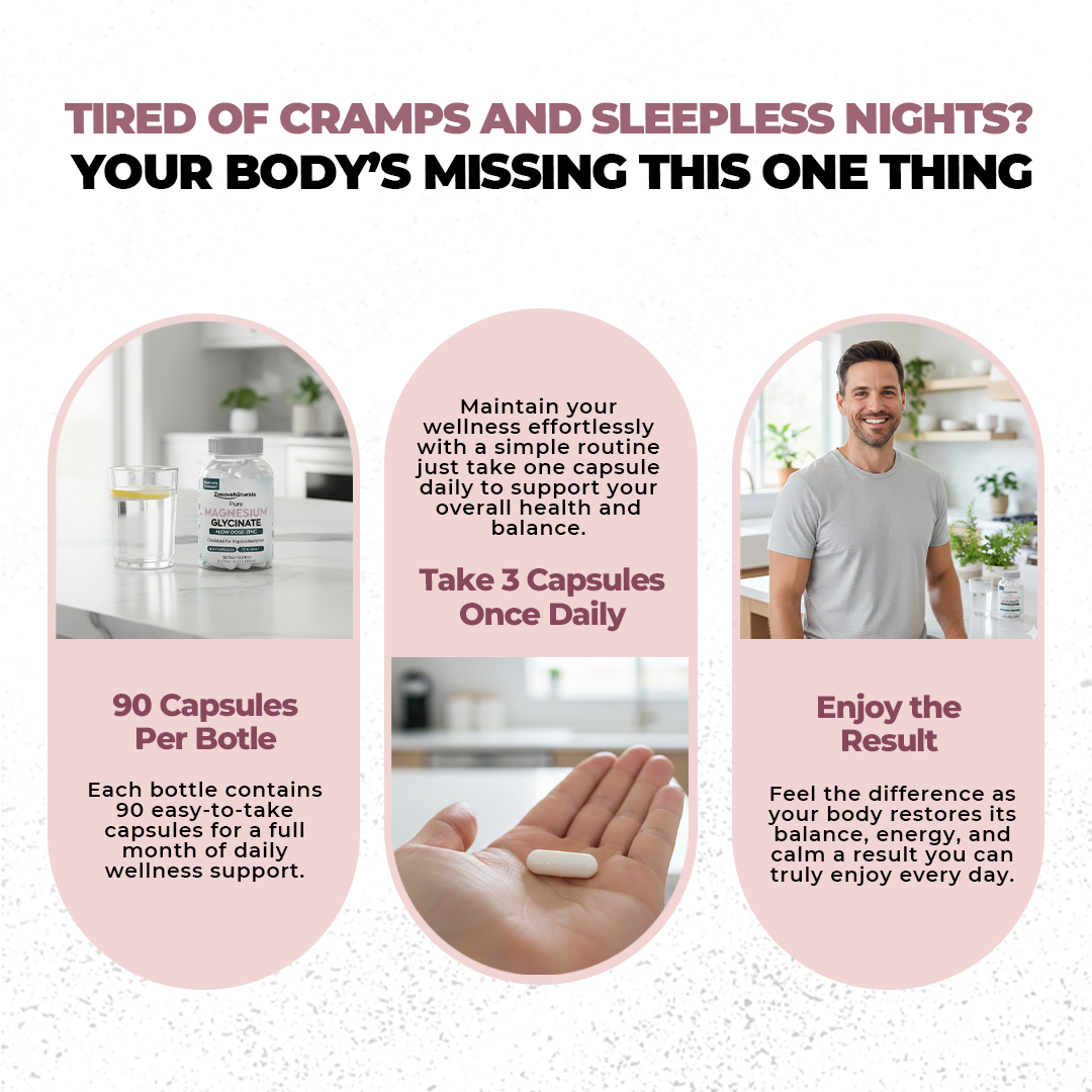Unlike harsh magnesium forms, our glycinate formula is non-irritating and stomach-friendly. Just pure, effective relief without digestive discomfort.